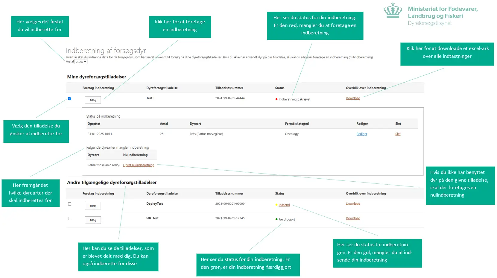 Hvis du har indsendt og afsluttet en indberetning, men har brug for at redigere denne, så skal du skrive en mail til dyreforsoegstilsynet@fvst.dk for at genåbne indberetningen.